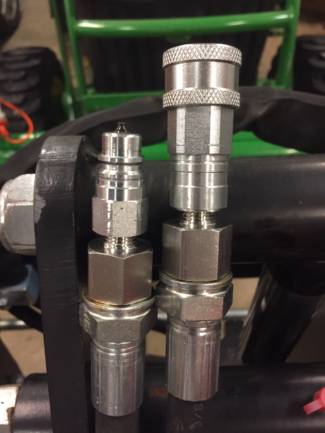 When I bought my grapple it came with 1/2 male ag couplers, but my 3rd function has 1/4 male and female couplers at the loader end. In order to use it immediately when I got it, the only local solution I could come up with was to get a female ag coupler then bush that down to 1/4" and then a nipple to the 1/4 coupler. The added adapter was an extra 6+" of awkward strain and weight cantilevered out from the loader frame. I want to finally get this completed to my satisfaction by cutting out all the excess fittings and couplers. The difficult part was that the grapple hoses are a 1/2 male BSPP fitting and the most common 1/4 coupler to match the tractor wants 1/4 male NPT.