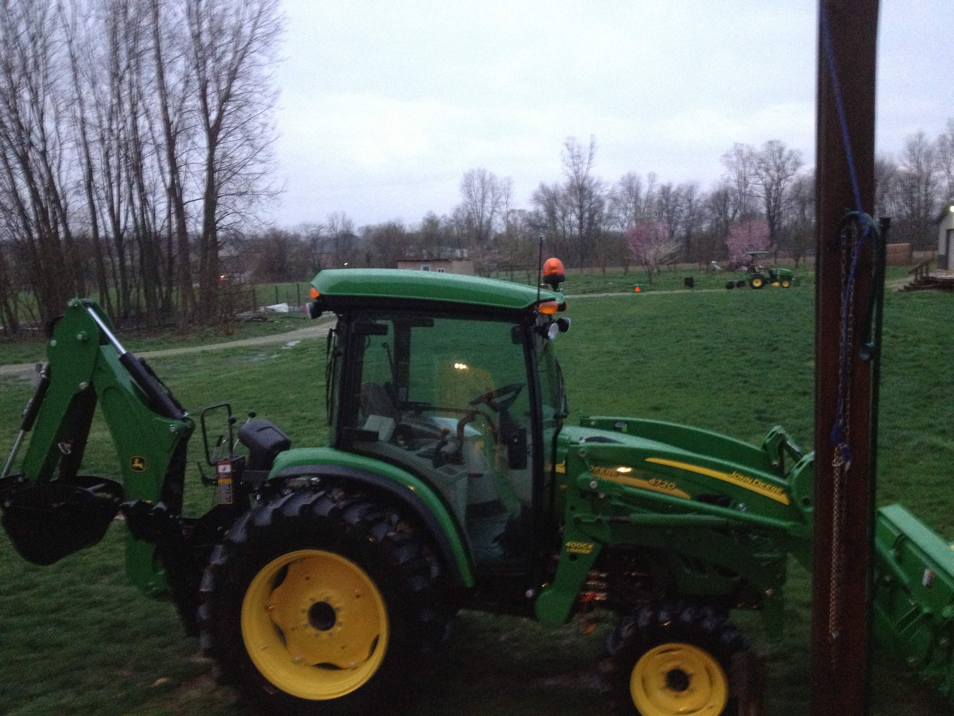 The new 4720 showed up yesterday. Got a little seat time in. One option I picked up was the creeper kit that lets you move forward and reverse and change idle speeds from the back seat on the hoe. I spent some time playing and I would highly recommend it. I like it much better than pushing/pulling with bucket or getting off and going around. I can't wait for it to dry out some to put it to some real work.