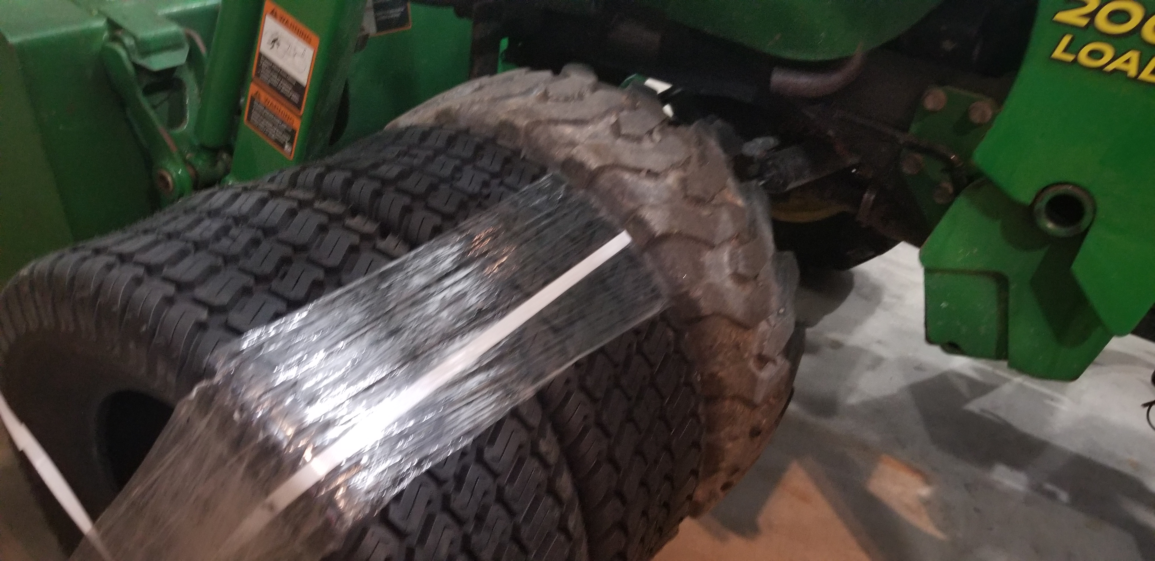 Wow, this turned out better than I thought. Got these front turf tires from my local TSC store delivered in 3 days at a great price and had them installed at a local tractor service shop. After running these front turf tires in mowing mode I can tell already they will be far less aggressive on tearing up the lawn than the R4's that were on the front. I've also found no issues in the muddy woods so far with traction likely because these turf tires are new where my R4's were older. I did run mulch loads in the loader and was also please to see that these front turf tires could take the load.
