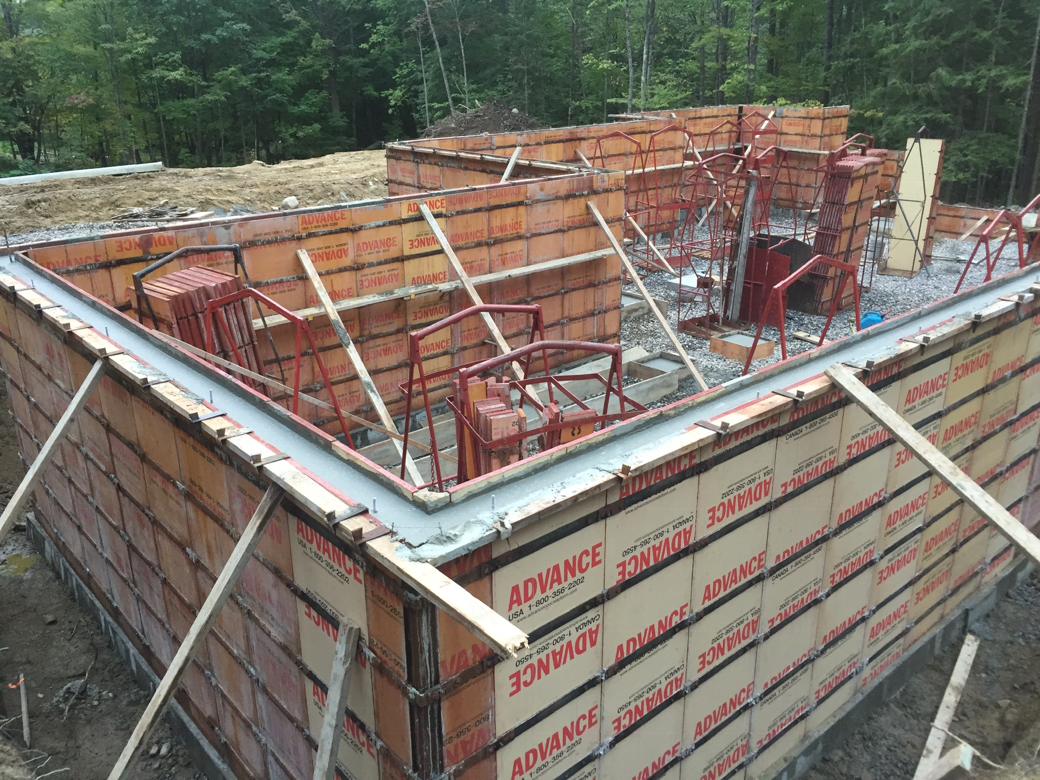 The home foundation is poured and forms removed. Today they sprayed with tar and added the 2" dense foam insulation.