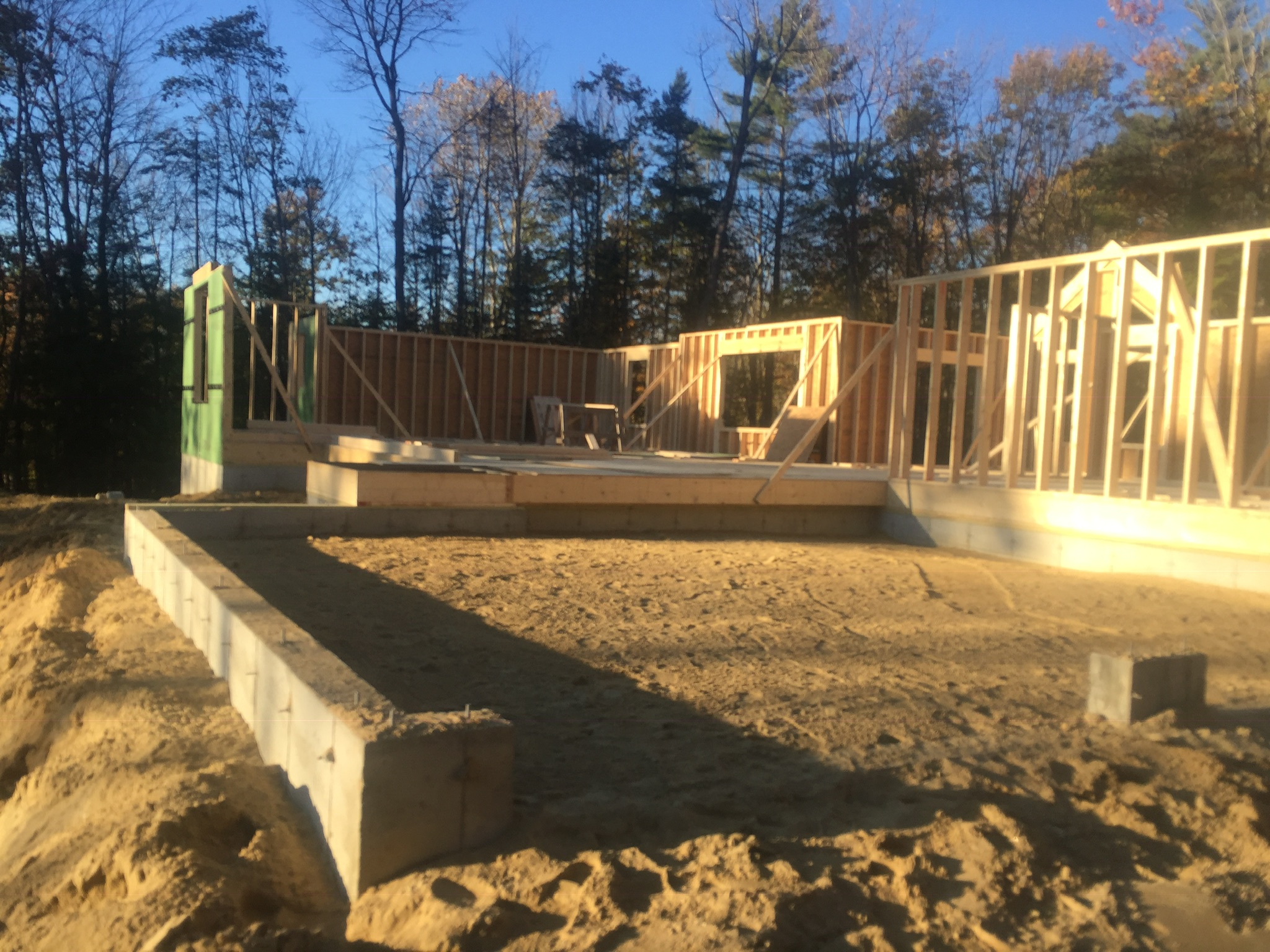 The walls are going up, delayed by rain. Still waiting for the trees to be clear d for the garage.