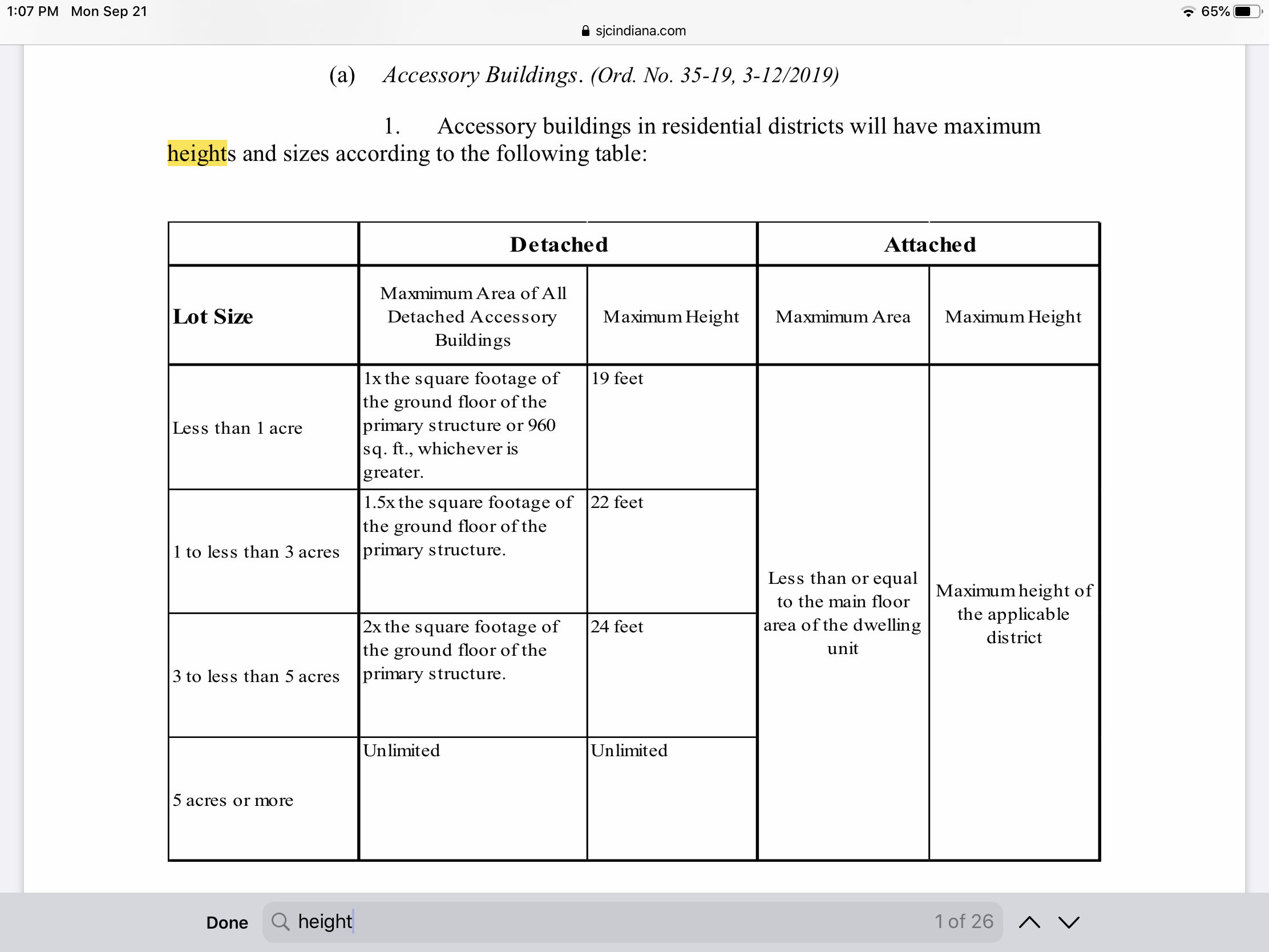 Here's ours for outbuildings, for example. It's based on total height. And that can vary depending on lot size. And square footage depends on the house and total of all outbuildings. I could have more outbuildings square footage than my neighbor because my lot is listed as 1.01 acres and his is less than 1 acre. Weird stuff, but it's the law.