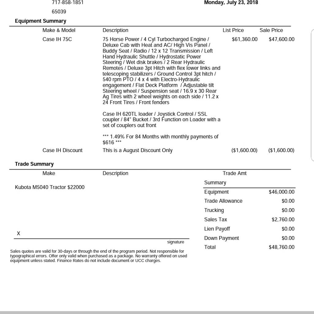 Hi all, I'm looking to buy a new (or if I can find one, slightly used) t4.75. My problem is our local dealers seem to only be interested in big commercial accounts and don't want to deal with small farm owners. I'm between Nashville and Huntsville and two dealers around Huntsville/Athens have both been around $53k for new t4.75 with 12x12 and loader and no other additions other than standard equipment. I'm hearing of others getting $45-48k. Can anyone suggest a good new holland dealer within a few hr drive of me? I'm in Taft, TN. I heard of another member in NC getting these in the mid 40s. I wouldn't balk at a road trip.