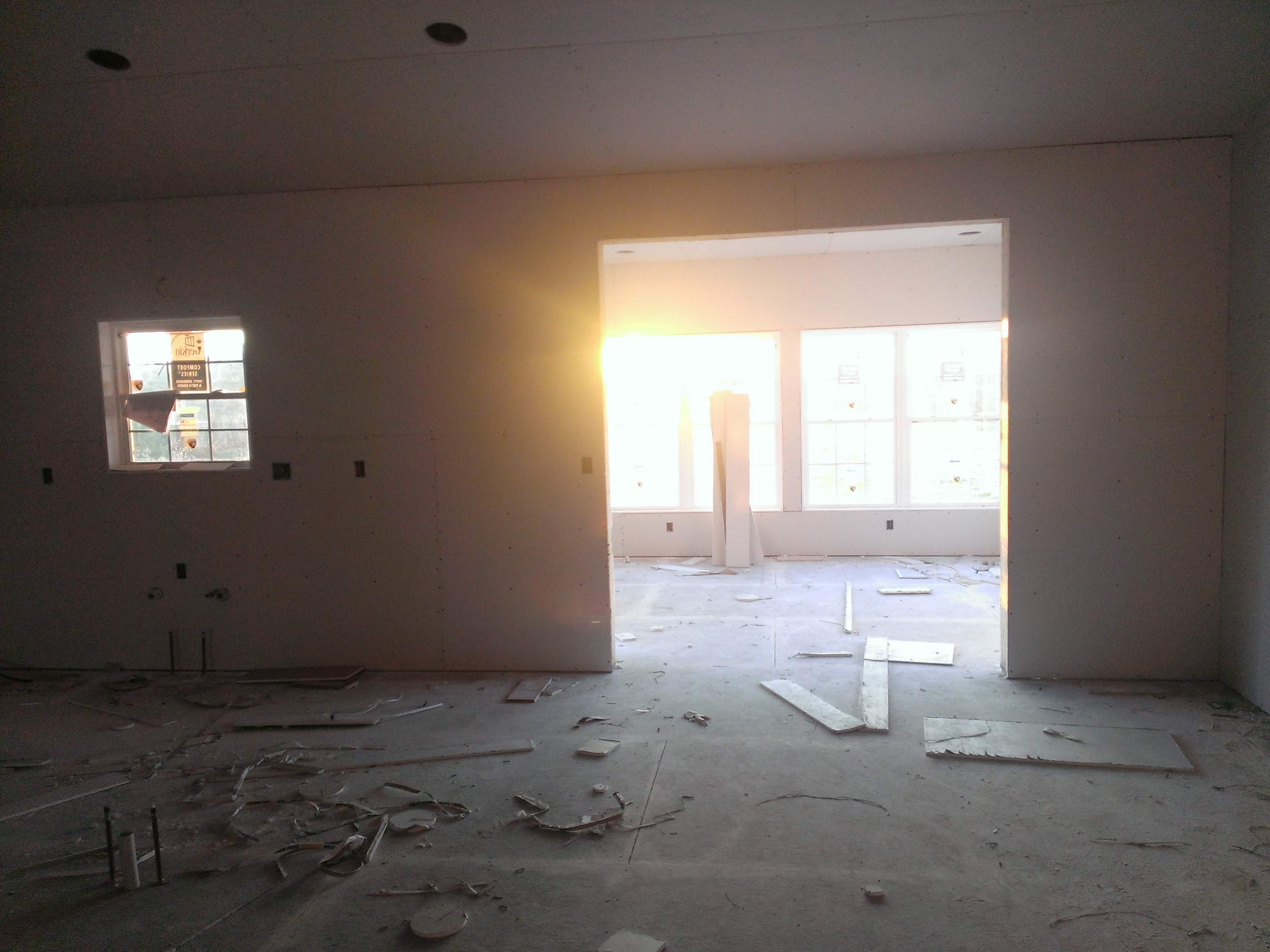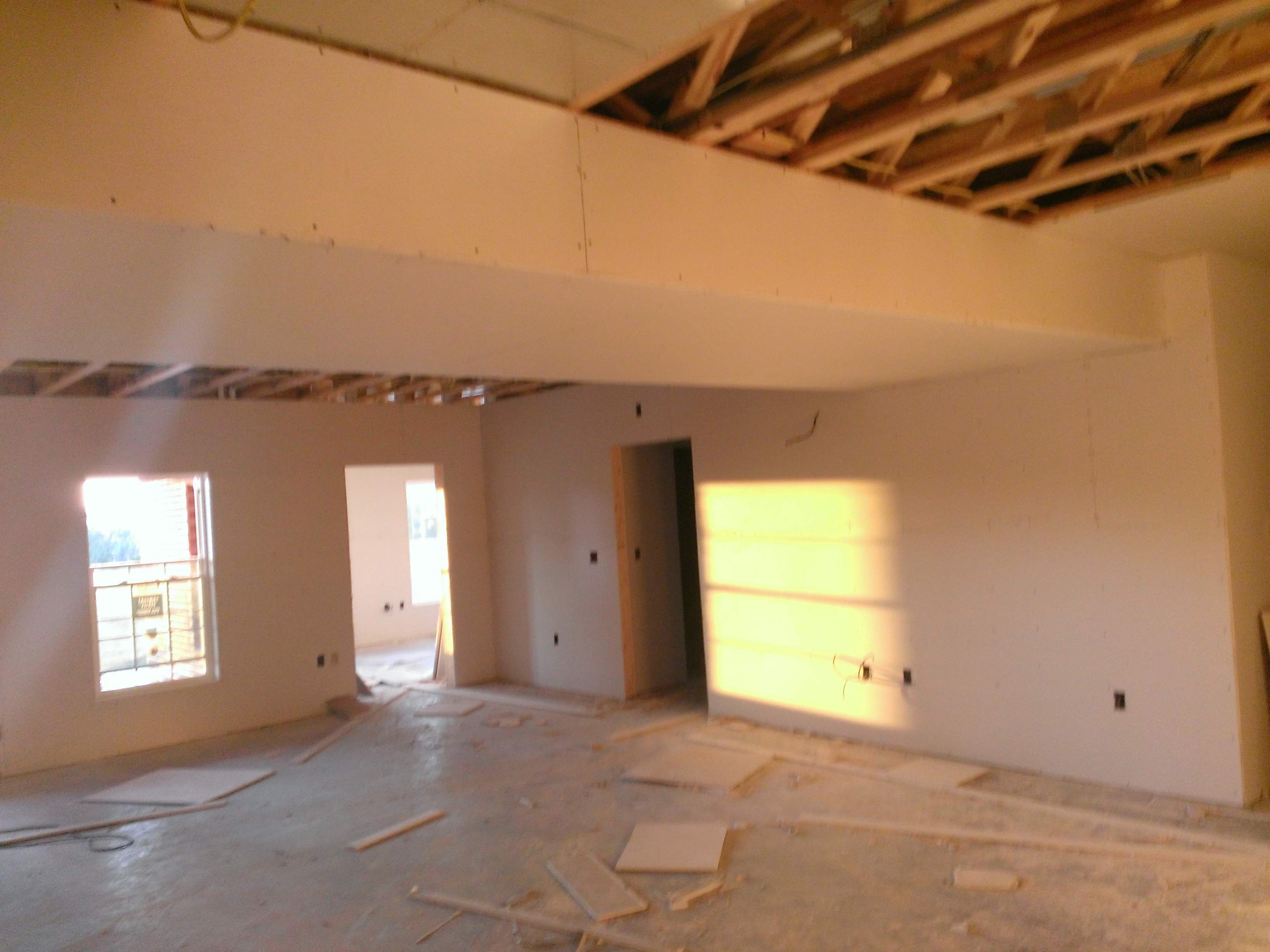 Sheet rock is all hung. Mudding/taping is starting today. Amazing how much difference it makes to have the walls covered. It actually starts to look like a house inside instead of boards stuck together.