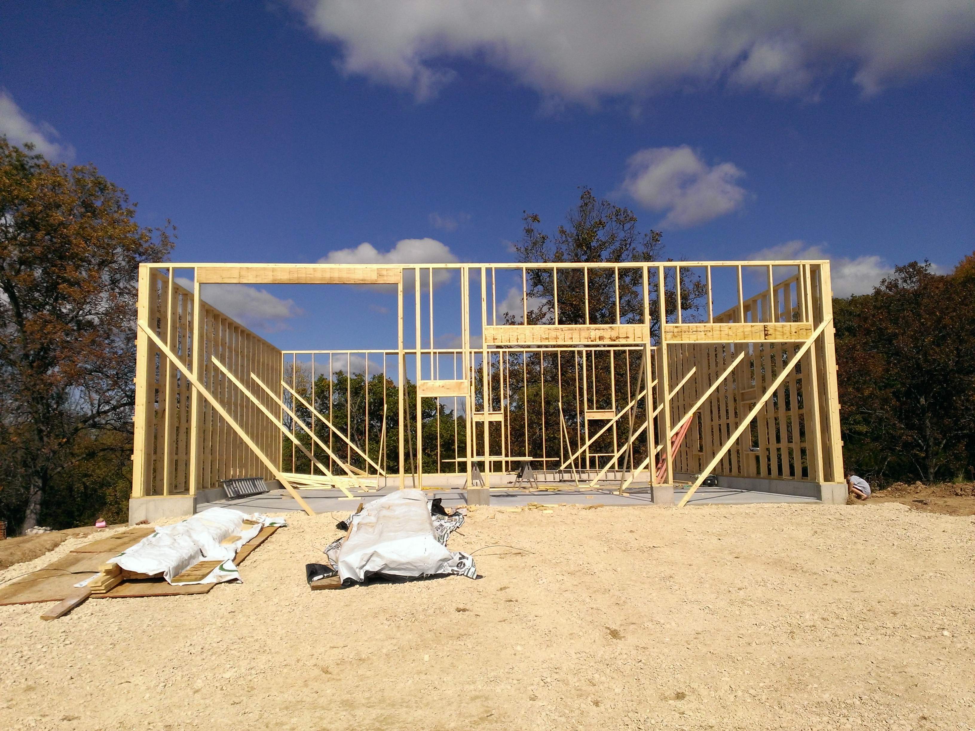 A pic of the garage before trusses. I did go with 10' tall doors on the lower side. Originally, I was going to go with the left side of the building being taller than the right side, but after talking with the contractor, I decided to keep the same height all across rather than a step in the roof.