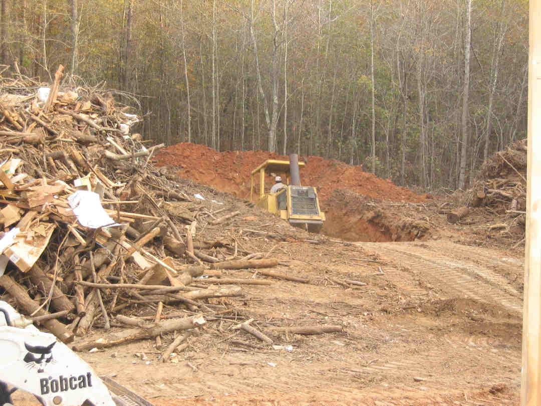 The previous pictures were from 2 weeks ago. This past week the drywall was hung and they started taping and mudding. The trash was picked up and hauled away, some more trees were removed from the back yard and the huge pile of trees that have been present on site since the initial clearing were burned. I'll post a few pictures of the cleanup efforts. First, the dumpster is full of trash and the tractor man is diging the pit to burn the trees.