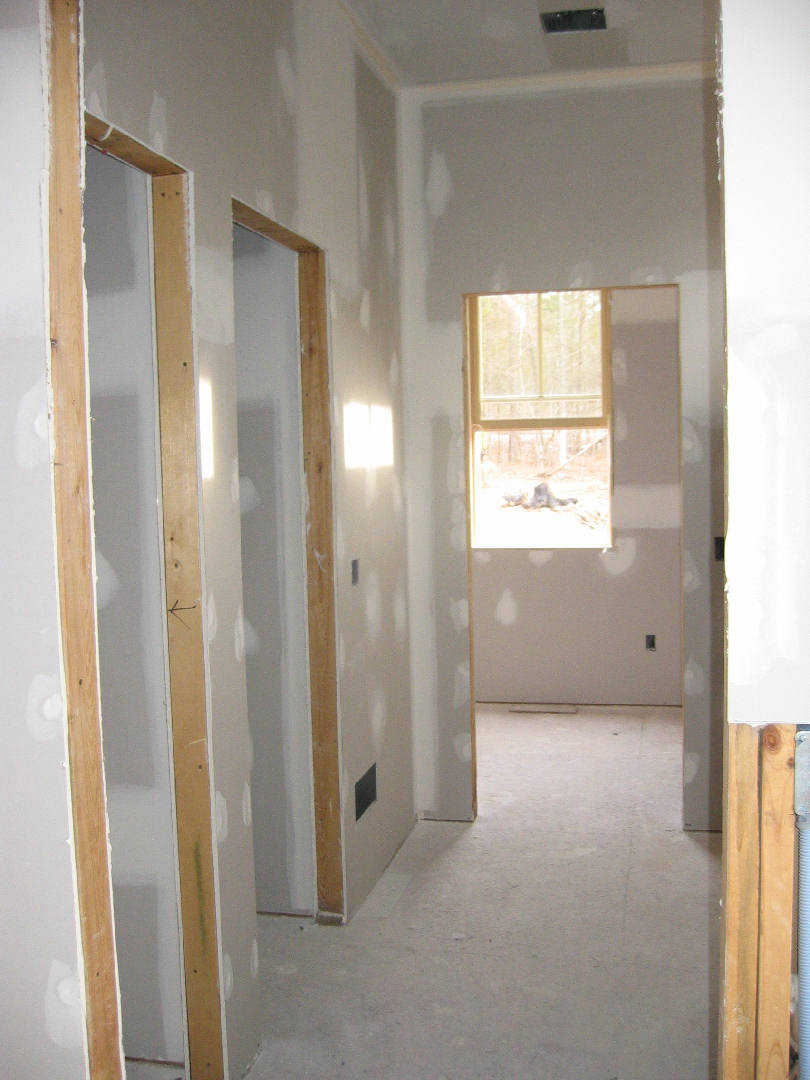 Although my digital camera does not have a sufficient wide angle lens to get good interior shots, I thought I would attempt a tour through the place with the dry wall up. We'll see how it goes. But, first, here's a couple of exterior pics of the painting that's been done so far - front of the upper level and, in the next picture, the garage end.