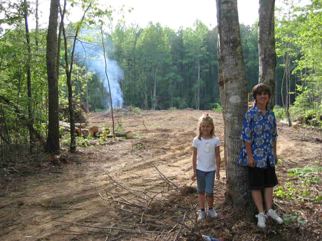 This shows the opening to the building site from the driveway. The front of the house will be just behind the smoldering pile of brush / roots.