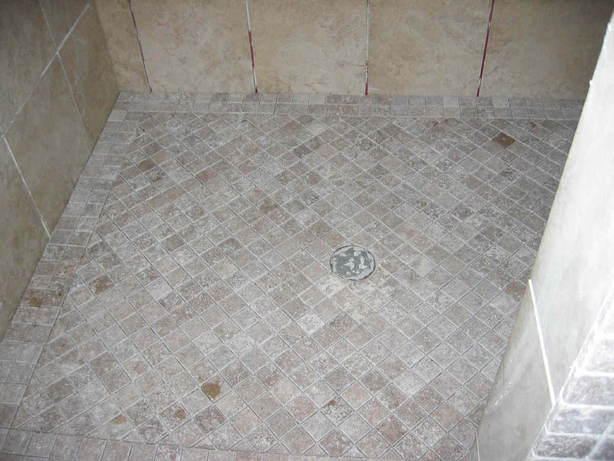 Here's a shot of the shower floor. Here he ran a perimeter of the 2x2 tile then did the rest on a diagonal. Looks good.