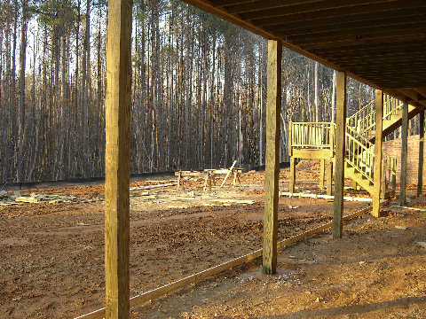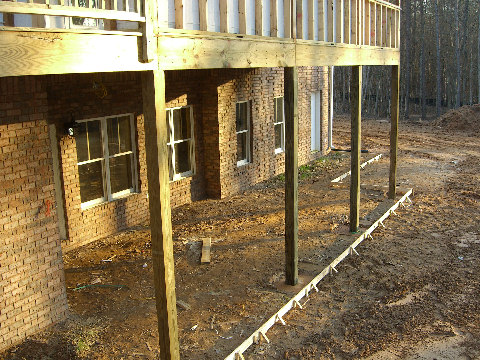 OK, now on to some recently completed work. Last week, I showed the footings for the posts that will support the screened porch. Here's the 6x6 PT posts in place. With these in, the tile guy can finish the floor of the porch soon.