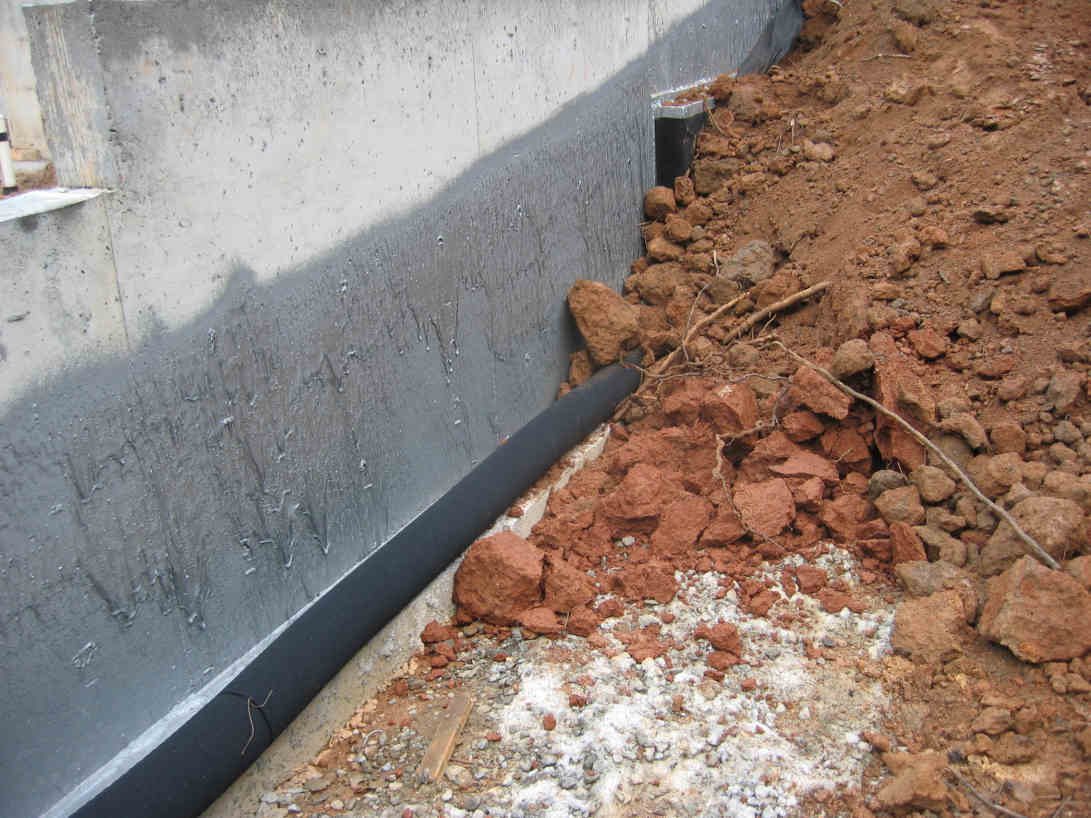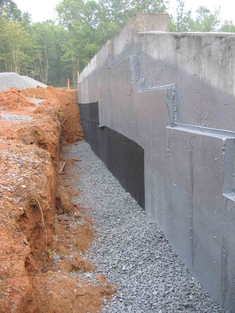 The first pic shows the silver spray-on material over which they placed a black fabric of some sort. The fabric is to keep the gravel and dirt from damaging the waterproofing material. Below the gravel is a fabric covered corrugated drain pipe. This photo also shows the brick ledge on the concrete wall nicely.