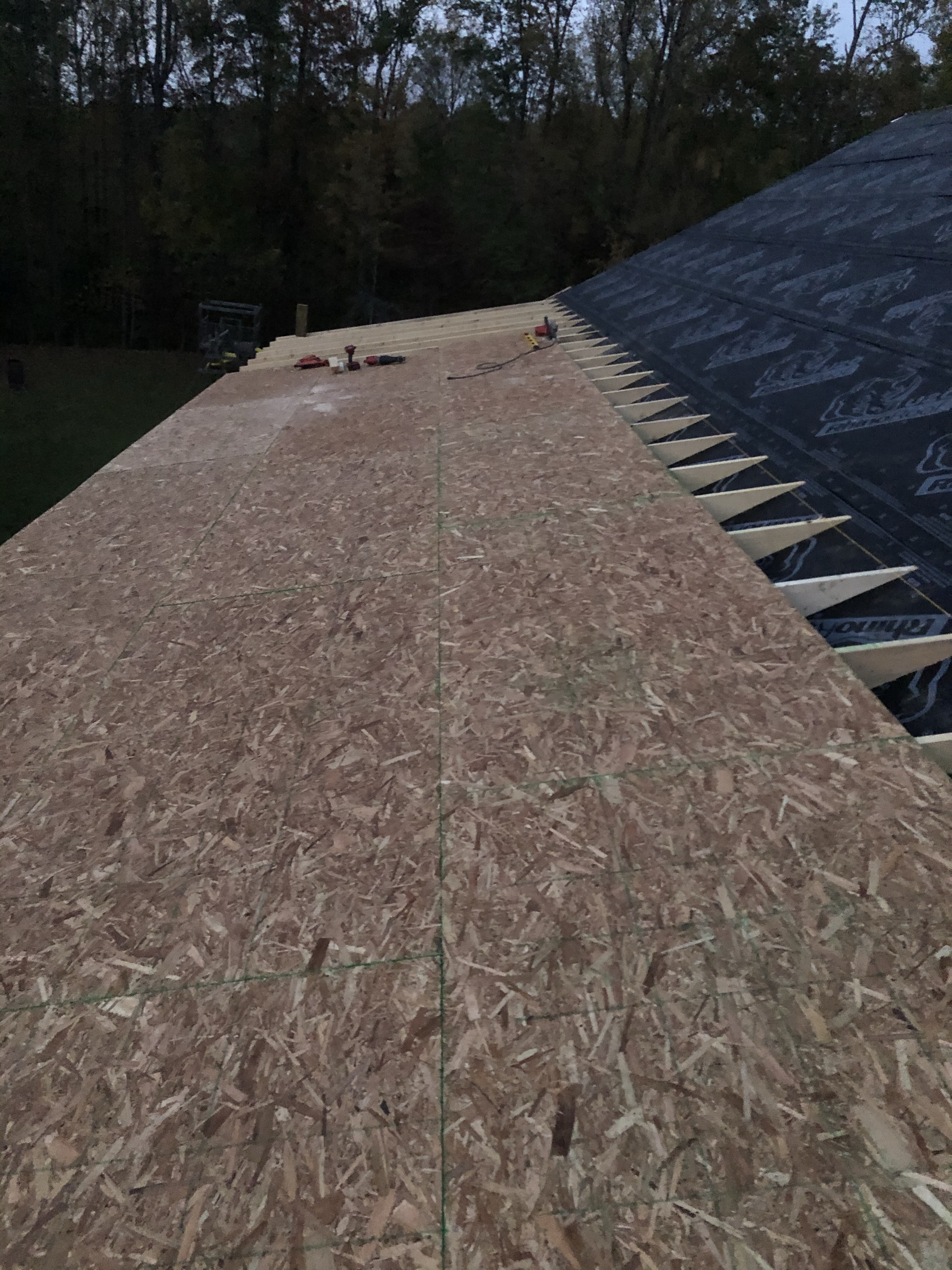 They are waiting on me to finish the back porch, and will be back Tuesday to finish since it’s supposed to rain Monday. I finally made good progress today, getting most of the sheeting on the porch roof. Wasn’t fun getting it up there by myself, but I got it. Tractor helped but couldn’t reach all the way up. I angled the forks so I could grab the end of the board and pulled them up. I’ll finish tomorrow once the dew burns off. It’s going to be nice to get this part completed.