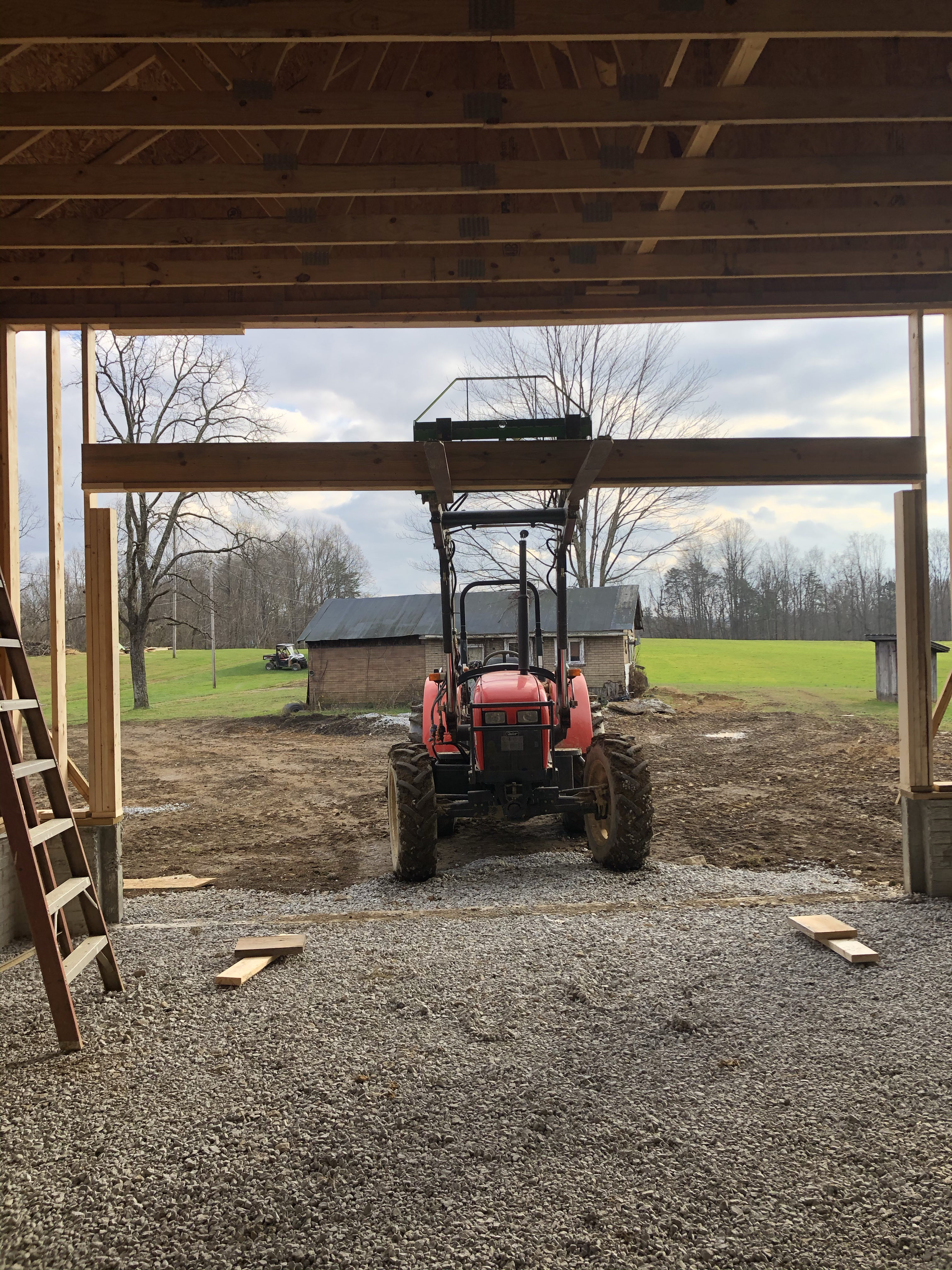 Not sure if I mentioned yet or not, but I purchased a set of forks for my tractor just before starting the build. One of the best purchases I致e made and I知 not sure how I would have done most of this without them. Here痴 a shot of the tractor helping lift the 16 garage door header in place.