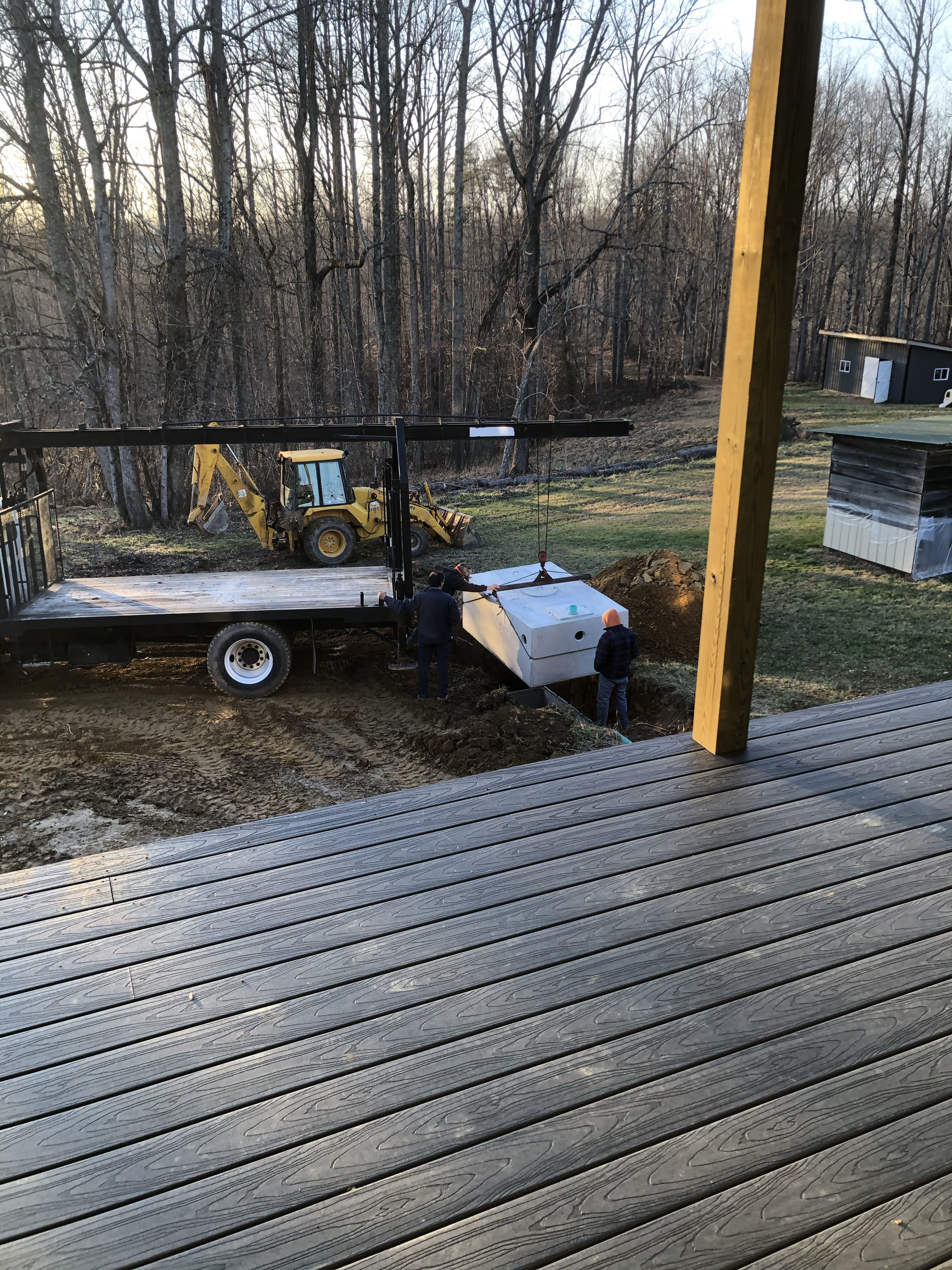 I was planning on installing the septic myself, as I’ve done multiple times before, but decided I don’t have the time and hired it out. They showed up unexpectedly about 3:30 today and within an hour or so had the hole dug, tank set, hooked up to the sewer line coming out of the house, and buried. Those guys don’t mess around, it was their second system of the day, taking advantage of the nice January weather. They will complete the install of the aerator and drain field tomorrow.