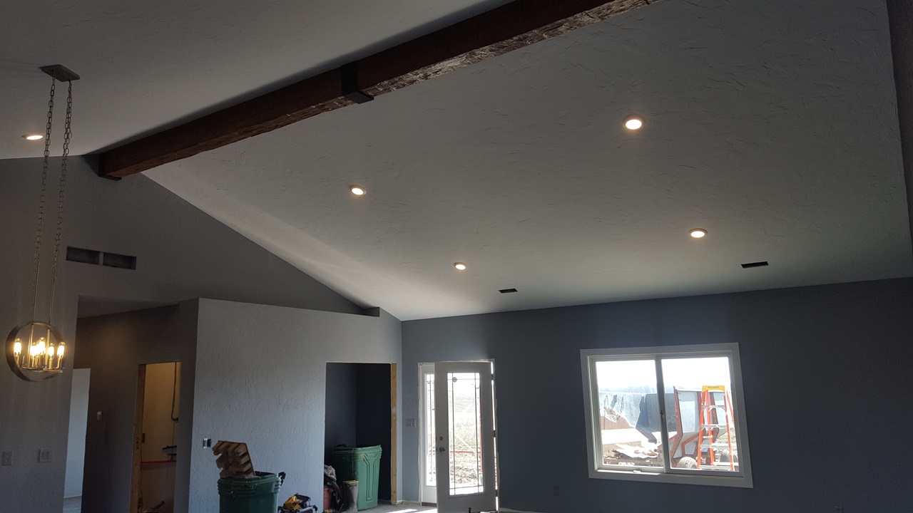 In the Living Room area the ceiling is vaulted. After they had the sheetrock done Terry decided she would like a beam at the peak of the vault. I asked the Builder about it. He chuckled and said I wish we had known that before we rocked. We would have added some reinforcement for holding up the beam. I said how about a fake beam? He said oh yeah, if that's what she wants it's no big deal to fasten up there and easy to add.