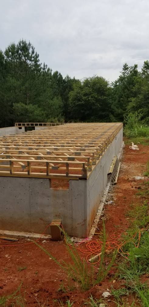 Told you it would be slow. But finally an update. A couple neighbors came over a few weeks ago and helped set the LVL floor beams. A friend came today and helped set half the floor trusses.