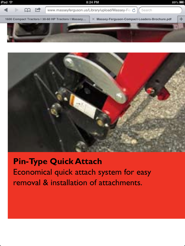 well someone will correct me but my MF had two options, the SSQA and the "pin" attach. The pin attach has about 7 pins on the bucket that hold it on in various places, that have to be R&Red when you change attachments. The SSQA has two springloaded pivot arms that you swing into position, easy as pie. The SSQA also is a std that allows you to get many attachments from different vendors instead of perhaps being tied to ones only from your tractor brand.