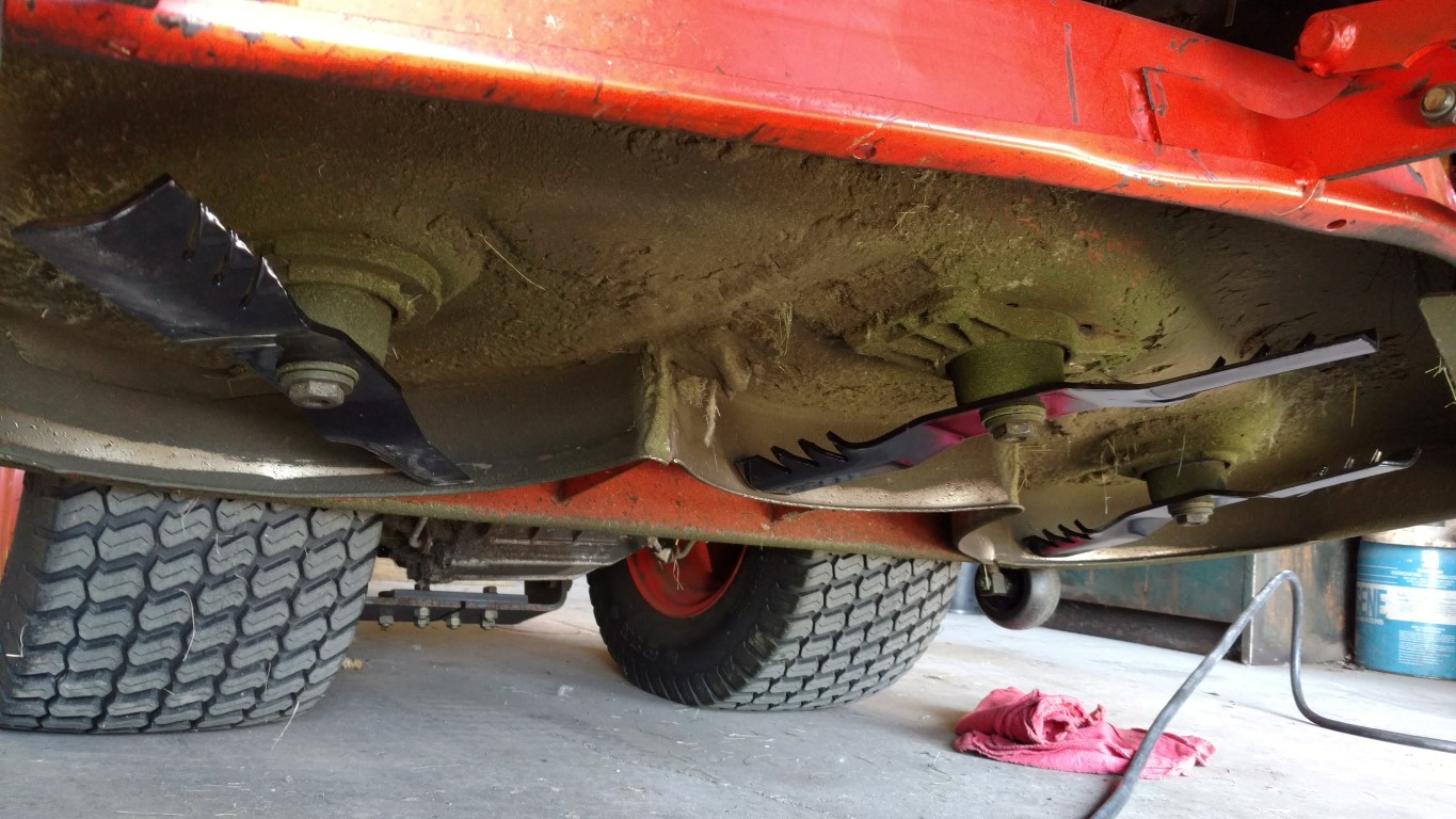 Installed a set of Oregon Gator blades on my BX. I also leveled the deck, it was 1/2" high on the right side, greased all the spindles, idler pulley, center pivot, gauge wheels, and checked the oil in the gearbox. It's good to go for the rest of the season, if we get enough rain to make the grass grow. After an unusually wet spring, it's been almost two weeks with no rain, and looks like it might be a couple more before we get any decent amount.