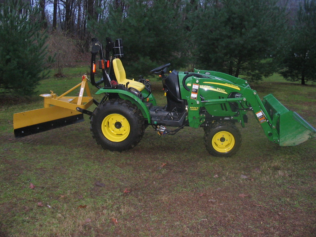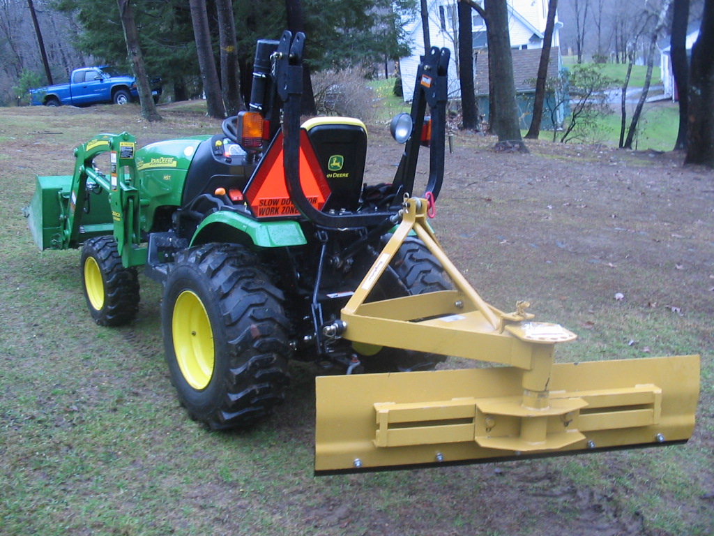 Well I finally bought a 5' King Kutter rear blade with offset and tilt, 90% of the use will be for winter snow work and then the occasional light grading of a few gravel paths. Went with the King Kutter because the price was right (compared to the frontier and others) and like I said mostly snow work, so I don't need a heavy duty blade. I work for ConnDOT so by the time I get home from plowing the roads my driveway will really need some attention. Went with the offset so that way I don't have to get the tires close to a couple drainage ditches next to the driveway as I'm plowing and risk getting stuck. I special ordered it from my local Tractor Supply and picked it up Thursday night after work. Today was the first chance I had to rig it up and attempt to test it out, I had the tractor out for about 30 seconds and it started pouring(just my luck). It has since cleared up so I played around and decided to take some pics to share with you guys. Hope you like.