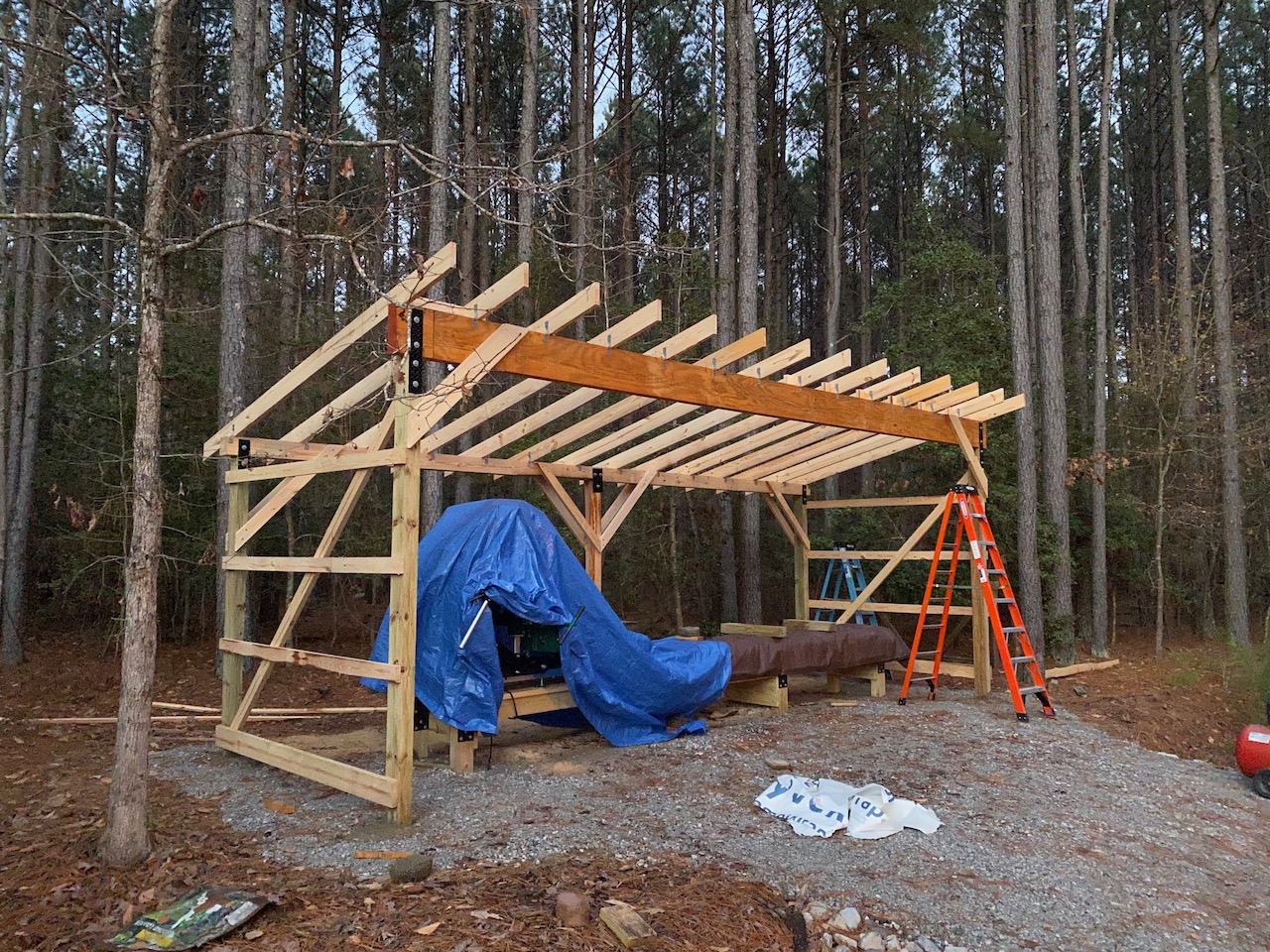 Tomorrow will be the roof purlins, fly rafters, fascia, and drip edge, then I'll be ready to start putting up the metal.