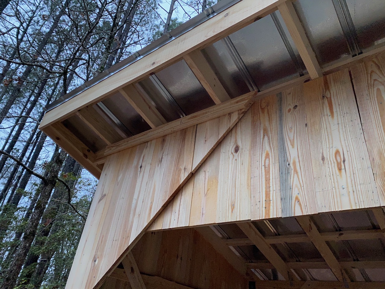 On the front wall, I let the siding on the gussets float above the center section. Joints were lined up above and below that character line, so the battens will also line up. I think this will give a nice look in the front, as opposed to having the siding all in the same plane.