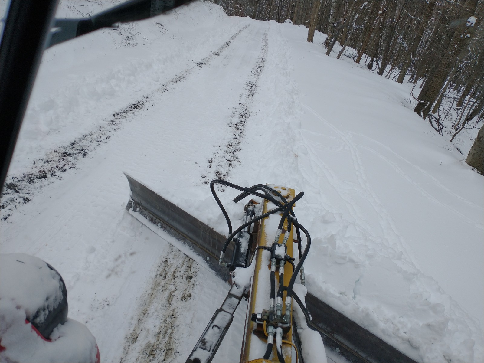 We got a pretty good storm yesterday. Blew around so much it's hard to tell how much we got. Predictions were all over - 6 to 14 depending on the exact storm track and how much rain mixed in. We didn't get rain but the start was very wet snow. Weighed down the trees in good shape before it changed to nice powder. A few pics plowing this morning.