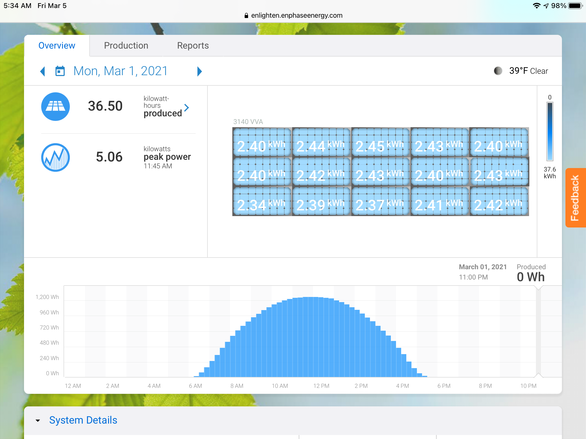 I’m using 350W LG panels with Enphase Microinverters. Peak output today 11:30 to 12:30 was 92%.