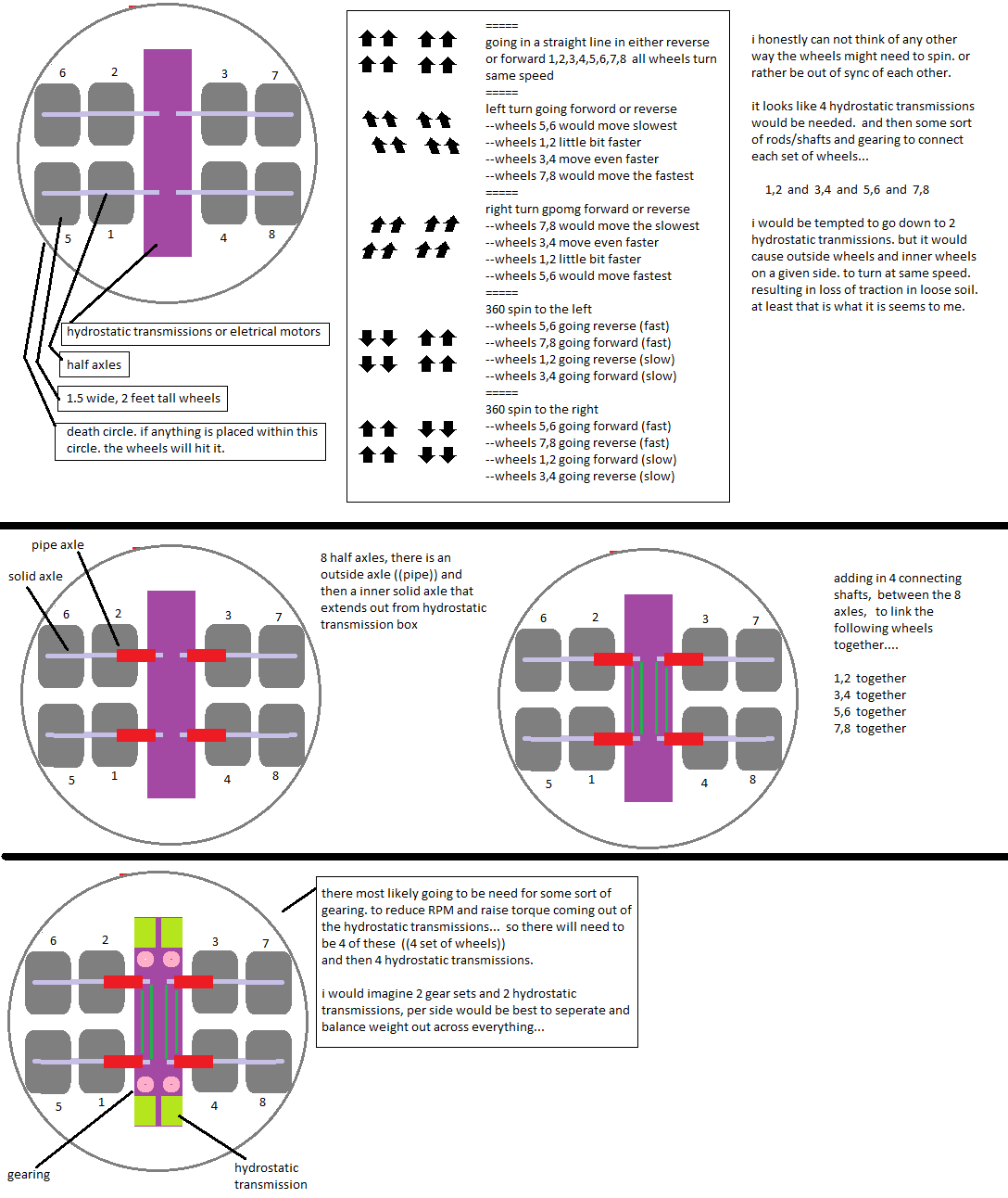 before i forget... was thinking of the current 8 wheel drive set.... and having 4 half axles.... i thought about turn things into 8 drive axles total. with each tire having a independent control for RPMs/torque/direction of turning. a drive shaft inside of another drive shaft.... the 360 joint. with the multi pipes going through the center of it.. is what spurred the idea. for a 8 independent wheel drive. per set of wheels.