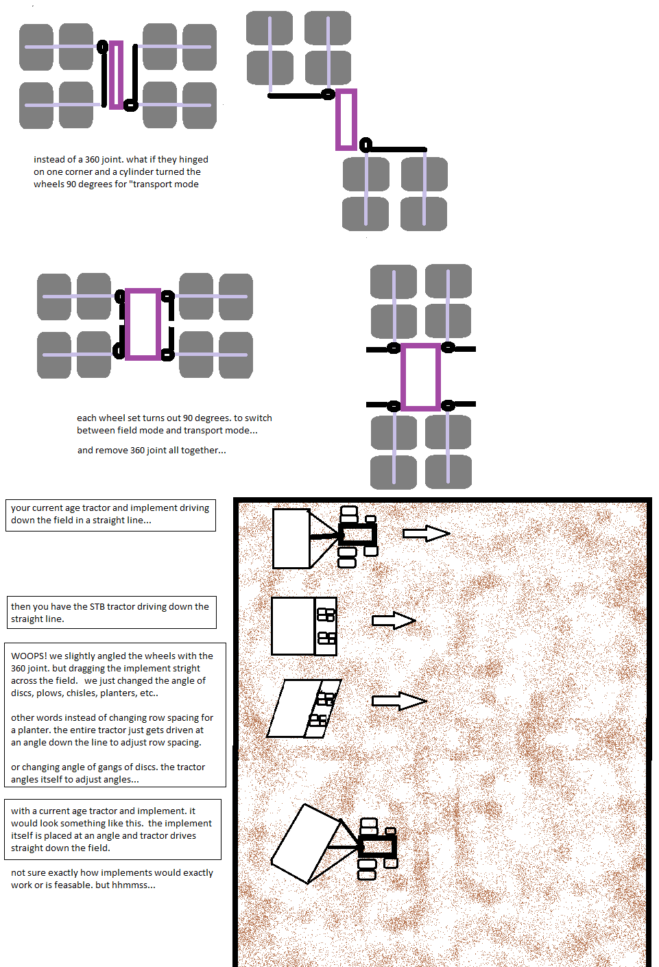 on other hand... i could almost see a motor on 360 joint to help transfer power/weight from one side of the wheels to the other side of the wheels in a turn. though it would be very minor. and not sure if it would even worth while. exception to perhaps lock the transport wheels into a position for transporting. well then again. i could see, someone getting into a tuff situation trying to get the STB tractor into some location. were being able to turn the 360 joint with a motor would help. or perhaps for what ever reason. one set of wheels comes off the ground. momentarily in a field. (quick slope changes) and if no motor on the 360 joint the wheels could turn out of position and really mess things up. the problem would be trying to sync the motor on 360 joint up with the wheels underneath it... hhmmsss....