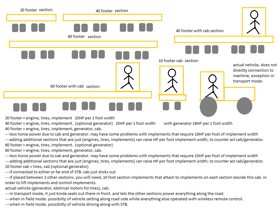 looking back at the "LeTourneau" land train. perhaps spiting the power sections up, to insert "wagons" in between the wagons. or heck even flat bed wagons. and placing 2 axles on each wagon. and a motor that allows front and rear axle on wagon to be turned. so you could have a "land train" wagon setup. for grain to round bails. to other... the wagons would only work in transport mode for STB tractor. but...