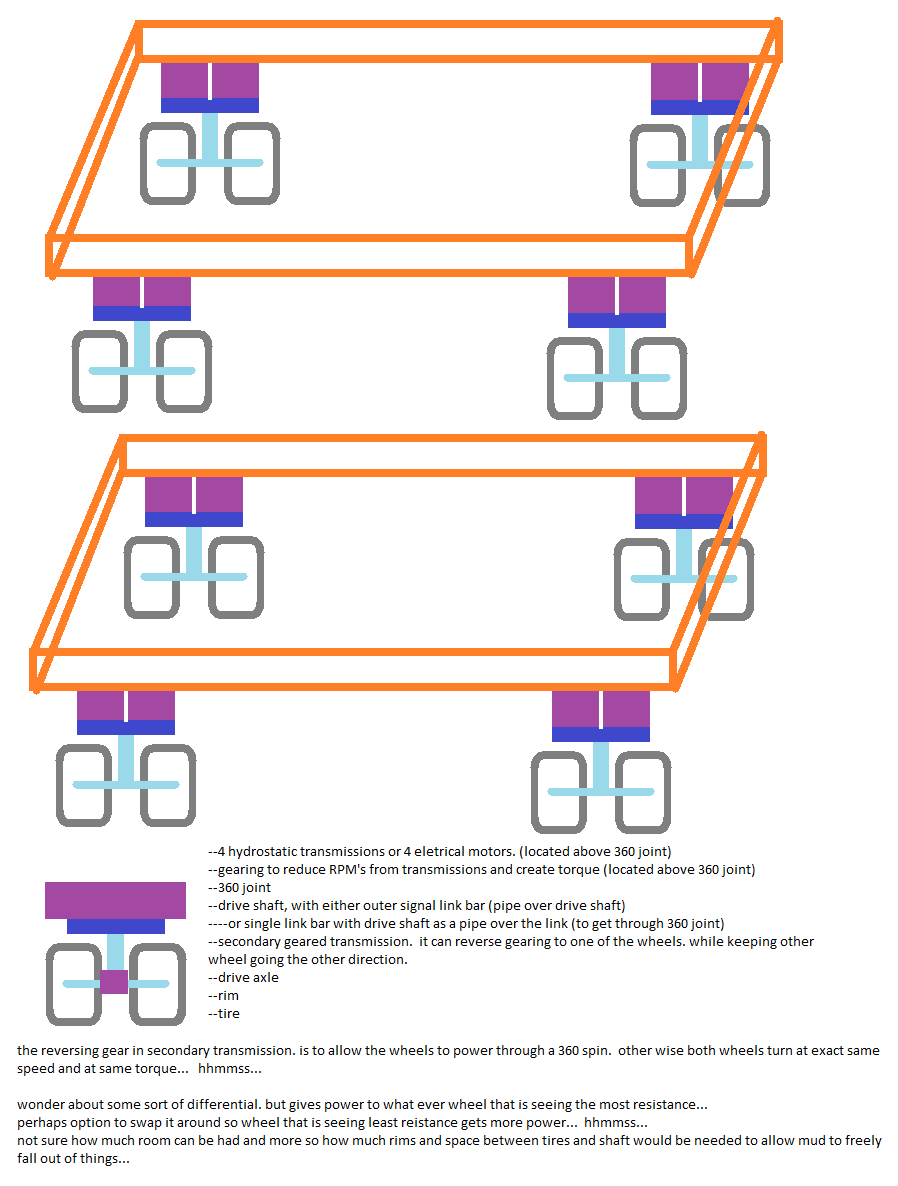 what about a drive shaft that just went straight through the 360 joint. then doing 4 hydrostatic transmissions, with each having a hyd pump. errrr 4 pumps, 4 hydrostatic transmissions, 4 wheel sets. but then i would have to deal with cooling hyd oil and filtering below the 360 joint. and would not easily be able to connect multi engines together.