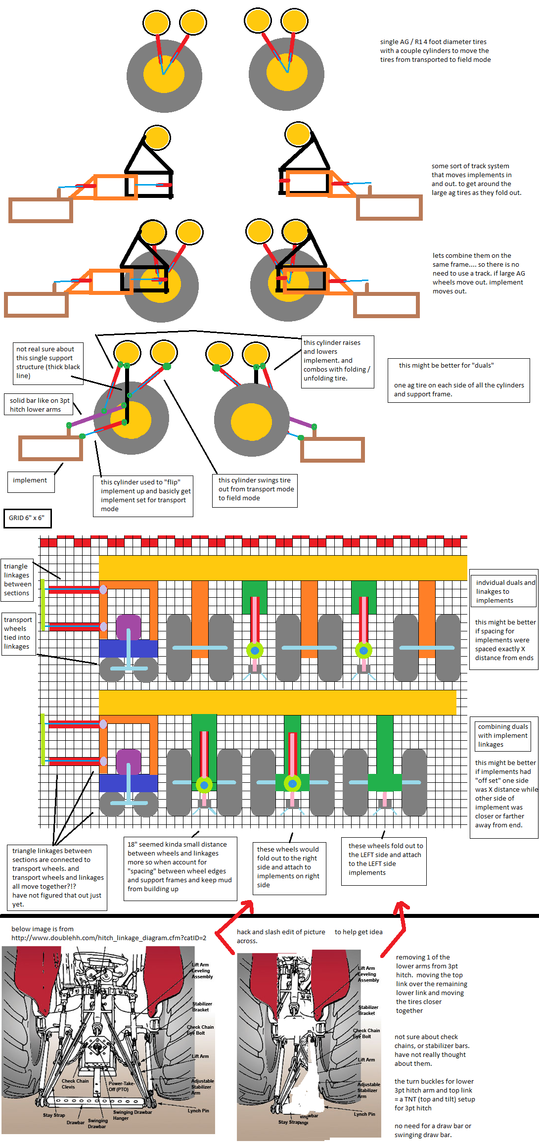TIRES, is it possible to get away from "longer cylinders" by simply dropping them down to the ground. and just letting the tire move itself from under the machine to a unfolded out position? and then using some sort of pin that is electronic. to locks some tracks or pipe together to keep them from sliding? naaa that be old outdated doings. gotta have the latest craze! though could it allow for less weight. and better structural support? na... folding things backup would be a pain in rump. and then trying to get through wet soggy mushy mud. a cylinder would have to be there. if not to fold / unfold but to push and pull things around. could see a tire getting swallowed up by mud. and tire just waving bye bye for dead as rest of machine went on down the field. if there were cylinders involved more likely wheel might be able to be pulled up and keep the machine going.
