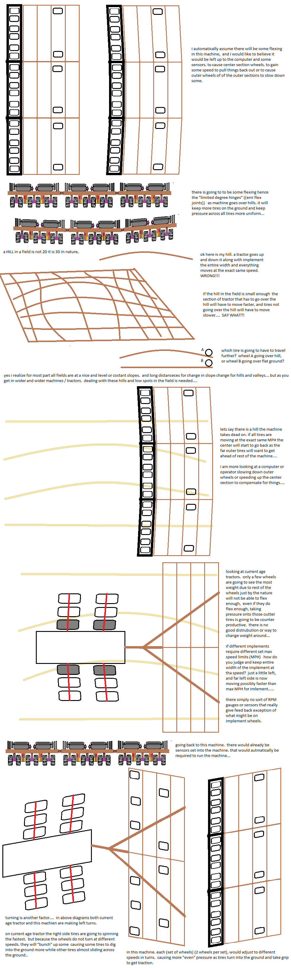 at moment machine is being geared towards fields that are hilly, and to handle all the various implements out there. fold up and be as compact as possible for transport. with quick unfold and go to work doings. and implements that are easy to attach / un-attach. figure if those can be nailed down making wider machines would be much easier...and just doing math and figuring measurements for longer frames and like for wider machines. perhaps just having some "short sections" of the machine on the far ends, and then going with "much longer" sections in the middle. to let the ends of the machine be better able to handle things better.