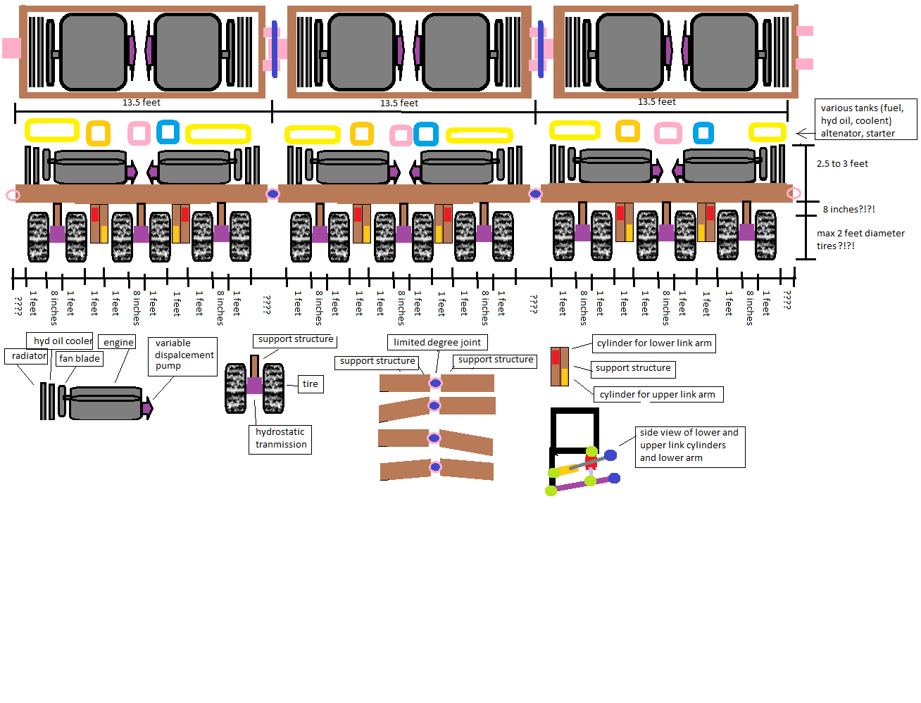 drew some implement diagrams and how they would hook up, along with engine box tilt. and looks like space between front drive tires and main frame that engies and everything connects to. this space looks like i will need to be increased some. though moving frame (front and back) frames closer together might give some needed room.... it is not like an engine is actually a box. but has more of a half circle bottom on them.. i would just worry about "twisting" the frame over the distance if they get moved to close together. if not nearing that at 2 feet distance from outside front and outside back of main frame...