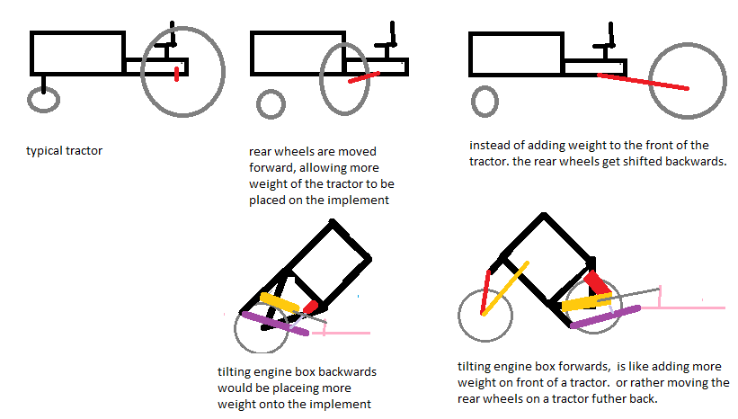 need to write down a few reminders for myself, before i forget them.... this machine and implements like a plow or disc. and causing engine box to angle backwards. to place more weight on implement and in that bottom plows and discs. vs placing all the weight of engine box on the front drive wheels.