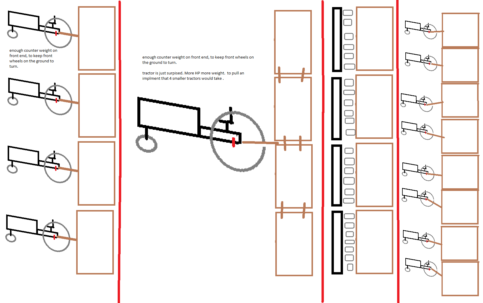 this might be a better comparison. in attempt to get idea across of multi smaller tractors pulling smaller width implements. the implements and rear wheels are combined for this "new tractor idea aka machine" but instead of just using those smaller size engines. larger size engines are used to obtain the higher efficiency of the bigger engines. to a point... hopefully combining other things and making better overall efficiency in the overall machine. that a larger size tractor would see. along with allowing for that dynamic weight change for rear tires.