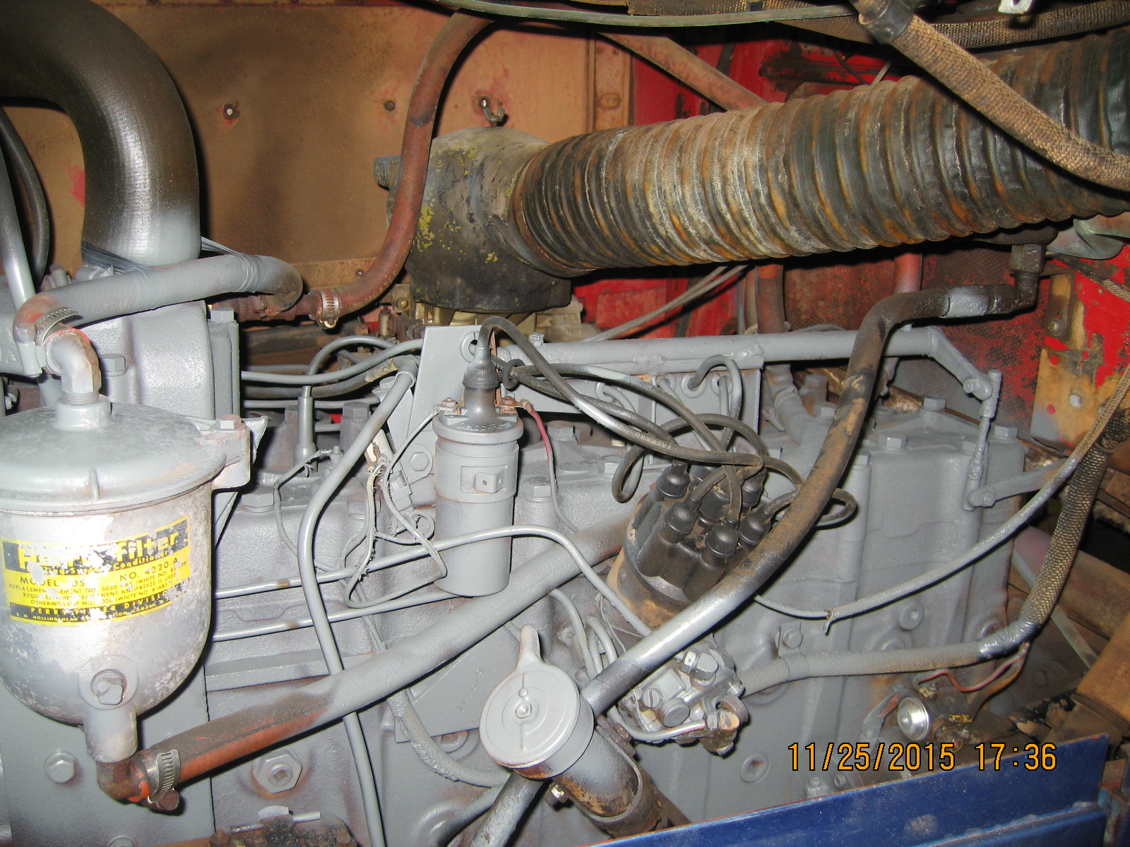 New to me, anyway. 1964 White 4200 winch truck. The engine is a White-built 470A Mustang, six cylinder flathead, 477 ci, five speed main trans, three speed auxiliary trans. The truck has less than 100,000 miles on it because it was used locally by a oil well servicing company. I bought it from the original owner. The engine runs if I squirt gas in the carb, I've sent the fuel pump away to be rebuilt. Cab has rust in the back corners and in the lower corners of the windshield. This is a very well equipped truck for its time. I'll do a partial restoration on it, the truck was too good to let go for scrap. I just wish the owner had kept it under a shed or at least kept a tarp over it.