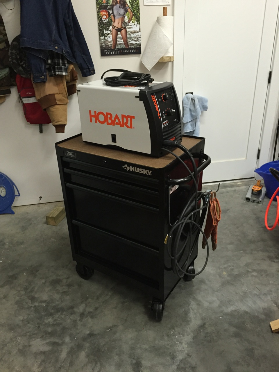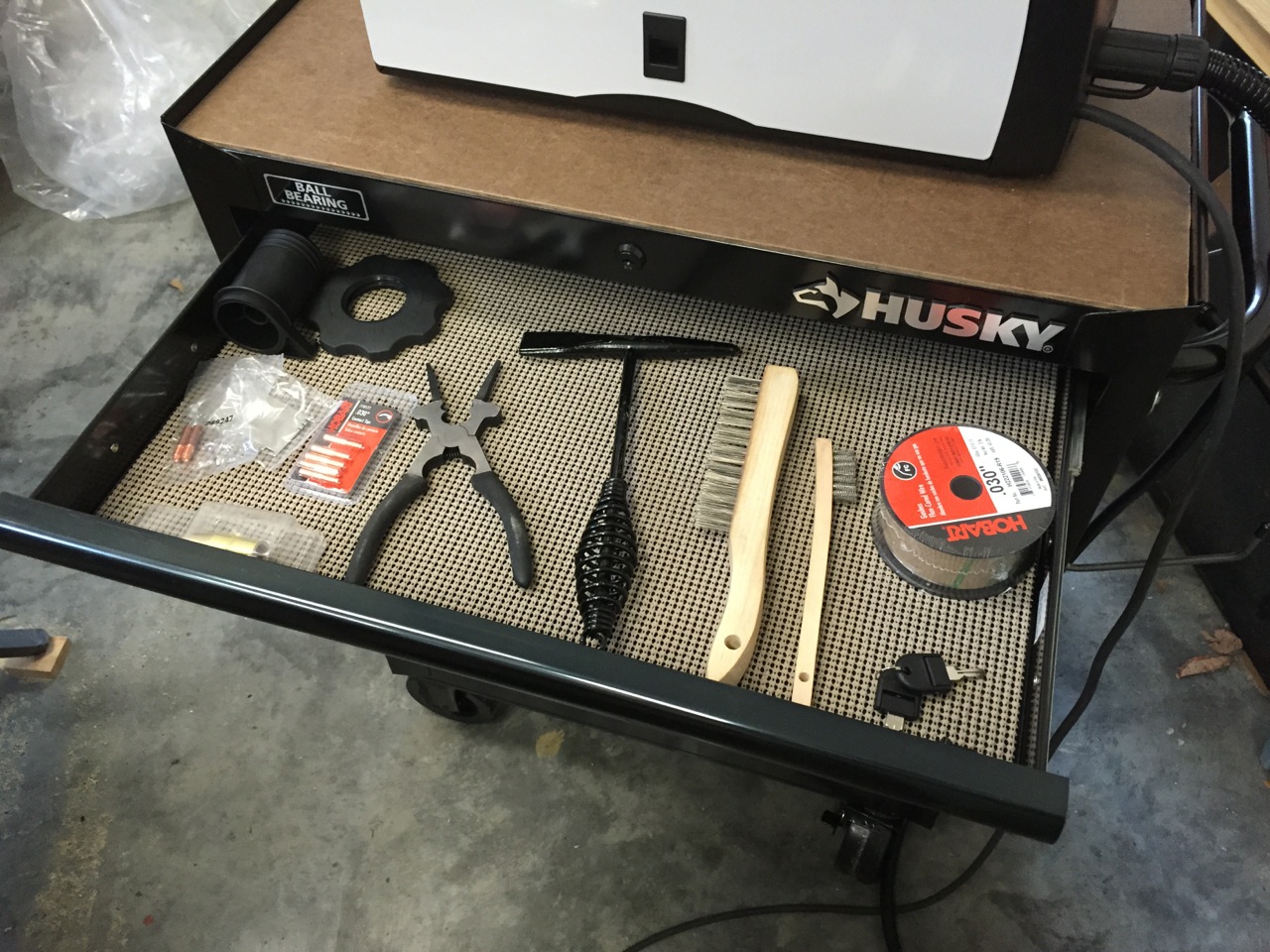 Been looking at welding carts for a few months and thinking about building one, but ultimately realized I needed something enclosed due to all the woodworking activity and sawdust in my workshop. So I have been looking around at rolling tool chests that would be good to support a welder and hold all my gear. Finally saw a price drop on a Husky tool chest at Home Depot and grabbed one. After looking at several brands, I think there must be one company making a lot of these tool boxes and cabinets. This Husky is very much like a higher-mid-grade Craftsman except for the paint job.