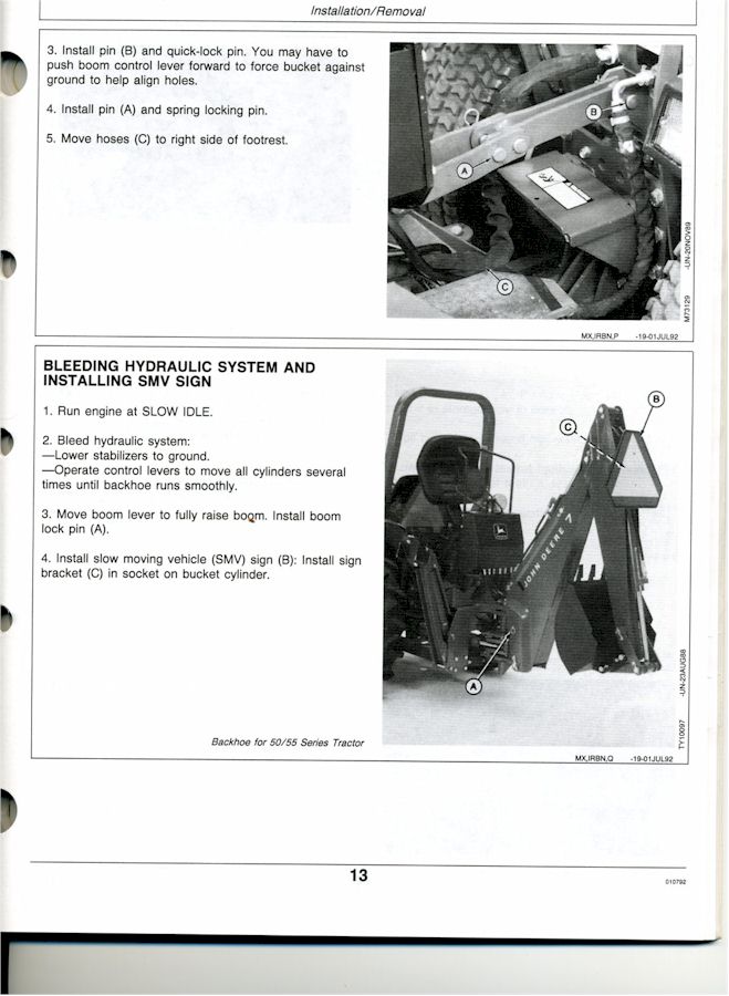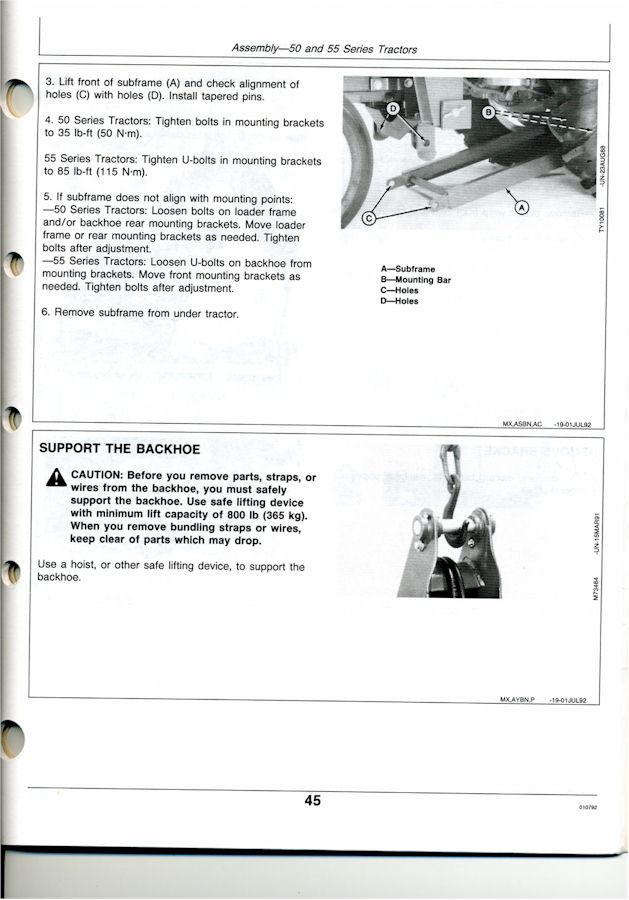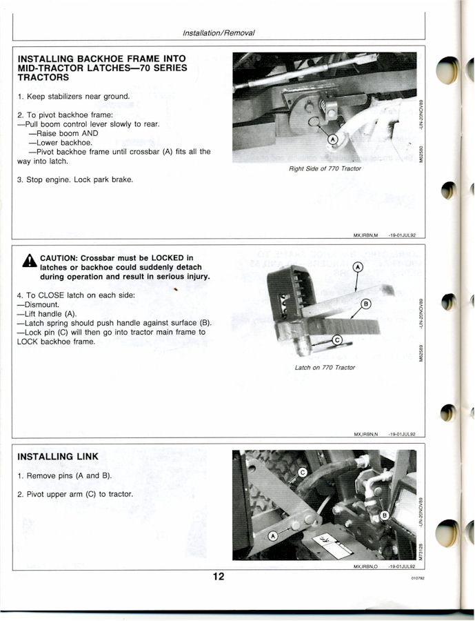 Basically I back up near and square to the backhoe, attach the hoses and lift the backhoe up to align with the rear mount bar. I then reverse snugly into the bar, and fiddle with the bucket height/backhoe feet height until the forward arms of the #7 align with the tapered pin holes. Insert the pins, attach the upper link bar and you are good to go.