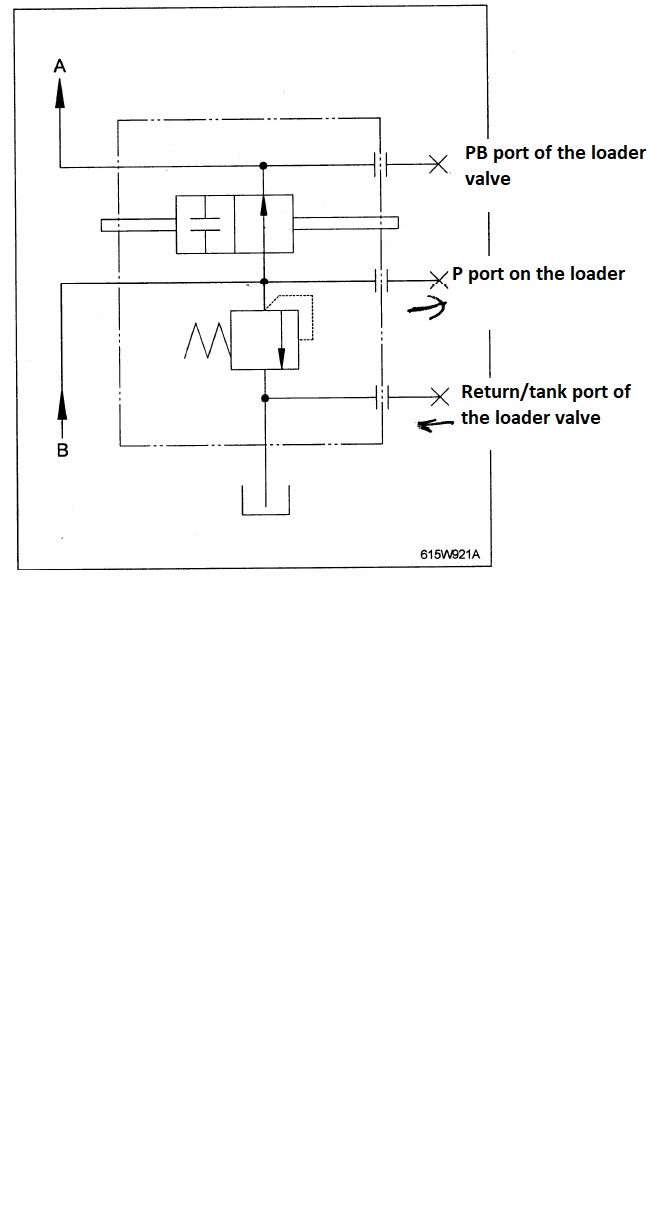 Well, this is a very confusing thing to deal with. I being told if I don't use the PB I will damage my hydraulic system. How does the PB/FEL valve control pressure over the pressure control valve in the hydraulic block? I have attached the hydraulic block diagram again. The item in the bottom diagram between the input B and the return is the pressure regulating valve for the entire hydraulic system regardless if there is a FEL or not. The FEL has a pressure relief valve too that protects it form over pressure. See attached.