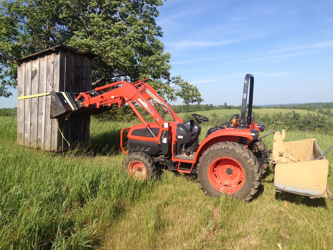 I used the FEL to take down the 8’x10’ lean to from the old shed and attach it over the back door solo in one piece. Much less work involved than dis- and reassembling. The most nerve racking part was getting under the raised leanto to raise the new supporting wall.