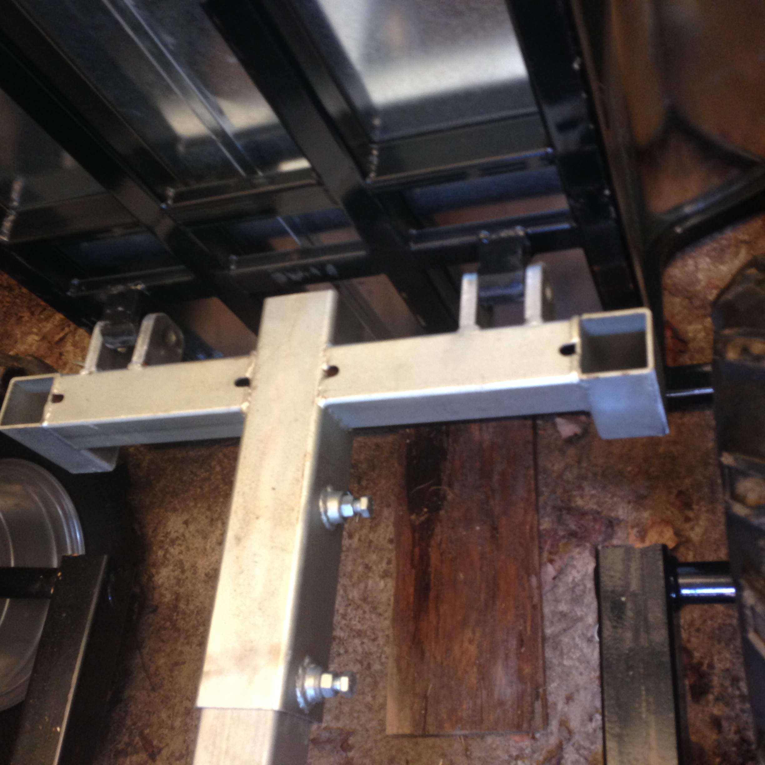 I had the dump box sitting to far back, and wasn't getting enough tonque weight, so I moved it forward. Piece of cake! You just raise the box all the way to vertical so that it sits on the ground, and then disconnect the two pivot pins and pull the trailer forward a bit. As you can see, the part that has the pivot pins on the undercarriage has two set bolts on the side, so you just loosen them and slide that part forward a bit, and then retighten. Then, using a similar procedure with their own set bolts, you slide the front crank tower and/or tongue jack forward as necessary by the same amount. (Or better still, just slide the whole inner square tube forward, which lengthens the trailer again.) Then, reconnect the box and lower it down again. Very versatile system, and you can make the trailer longer or shorter as you wish. So far, so good!