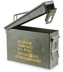 40 mm ammo box works very well and if you bolt one latch, it acts like a hinge. Love mine.