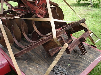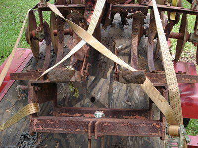 Well, I finally was able to keep the implements up. It took a week of phone tag. Of course the trailer tires had loss air so I could use the one they were sitting on. The 16' trailer, that I am co-owner with, was in use by others so i couldn't use it to take my tractor to load these up . So i was forced to use a 5x12. Well the disc wouldnt fit, it was to wide, so i had to turn it sideways and wrestle it on. I had my atv and used the winch somewhat to help. But the plow and cultivator I had to actually pick up by hand and place on the trailer on top of the disc! I thought I was going to have a heart attack doing this, because I am a big 'ol boy. Anyways I made it home safe and sound. I was able to get it all loaded right before it started to rain.