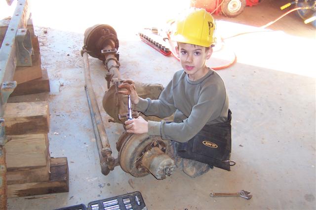 It took some prep work, but fairly qickly, we had the frame in the shop and up on blocks. Then I showed him how to use the impact wrench and gave him the half inch sockets. I told him to take off anythng and everything that he could!!! I don't know if this is true with all 7 year olds, but this one just loves to take things apart!!!!!!!!!!!!
