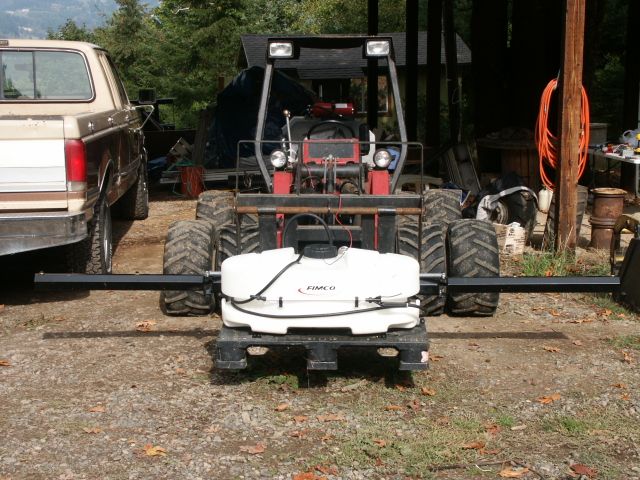 I have a FIMCO P/N LG-25-SM, which is a 25 gal 2.1gpm 12V spot sprayer. I transport/use it on my tractor carry-all, but you can get the equivalent sprayer on a tow-behind trailer or as an ATV attachment.