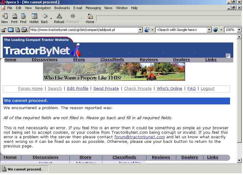 This is simply an issue with your browser... not the forum. The error message is generated by the forum, so your browser isn't recognizing something correctly on the previous page, wherever you enter info... if you enter anything in. If you just look at the way Opera renders the page (generated in basic HTML) it's no surprise there are other errors.