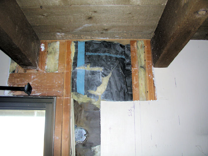 Update: I opened up the wallboard a bit to get a better look at the right side. The stud I planned to use as the king stud for the opening is only 2" from a stud adjacent to the 4x4 post supporting the ceiling beam (see pic).