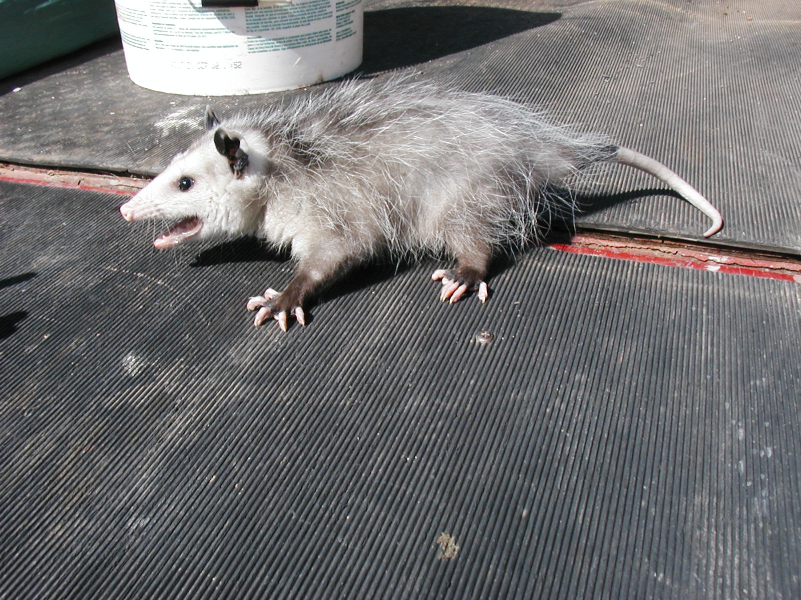 One day I was hauling a lot of brush out of my yard and this little possum came running out under the tractor, I must of loaded the rest of the family on the dump trailer as I never saw any others that day, anyway the thing was so little I felt sorry for it and put him in a box, we took care of it for about 8-10 weeks, the kids loved it and did handle it often but I made sure they washed there hands after every exposure. He ate different things but was pretty finicky, it surprised me how clean and soft this thing was, not like the older ones, also it was very gentle never tried to bite, but he would bluff with that menacing mouth open look, wouldn't make a good pet though, had zero personality. We let him get bigger and let him go at a local vegetation land fill, figured he'd have a chance of surviving there.