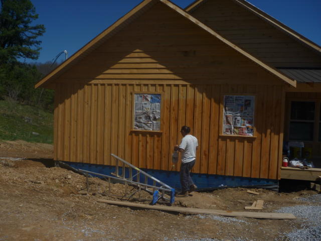 Some pics of the siding in progress. The 2nd pic is of the scaffolding we had to build in order to get up on the high side. That peak is probably about 30' off the ground. The 3rd and 4th pics are of us spraying the siding with clorox water prior to staining. Unfortunately, we didn't around to actually staining that day and still haven't. The weather isn't cooperating. It has to be above 50 degrees for at least 48 hours after staining...
